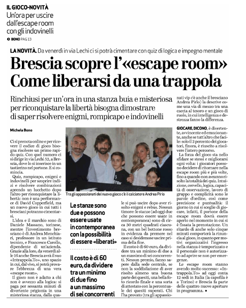 Ci si prenota online e per ricevere il codice di gioco bisogna risolvere un primo rapido quiz. Con quel numero ci si dirige in via Lechi 52, a Brescia, dove lo si inserisce in un tastierino nel portone. E si comincia. Quiz, rompicapo, enigmi e indovinelli per scoprire indizi e risolvere combinazioni aprendo un lucchetto dopo l’altro per riconquistare la libertà: non è una performance di David Copperfield, ma un nuovo gioco in cui tutti i bresciani potranno cimentarsi. L’idea e il marchio sono di Daniele Massano, torinese, mentre l’investimento bresciano è di Andrea Menchiari, professore in un istituto tecnico, e Francesco Carollo, dipendente di un’azienda. Grazie alla loro, da venerdì alle 16 anche Brescia avrà il suo «Intrappola.To», uno spazio in cui, dal vivo, si potrà provare l’ebbrezza di una vera «escape room». Il gioco non è adatto a chi non è avvezzo alla logica: si paga per sessanta minuti di divertente prigionia in una misteriosa stanza, dalla quale si può uscire dopo aver risolto enigmi e rebus. Nessun timore: le stanze (ad oggi due che possono essere usate in contemporanea) sono di circa 30 metri quadrati ciascuna, con un bel bottone rosso in evidenza da premere nel caso si desiderasse uscire prima della fine. Il costo è di 60 euro, da dividere tra un minimo di due a un massimo di sei concorrenti. Nessun premio, fanno sapere dalla sede centrale, se non la soddisfazione di aver risolto almeno una buona parte dei quesiti, una bella foto ricordo finale e una sorta di