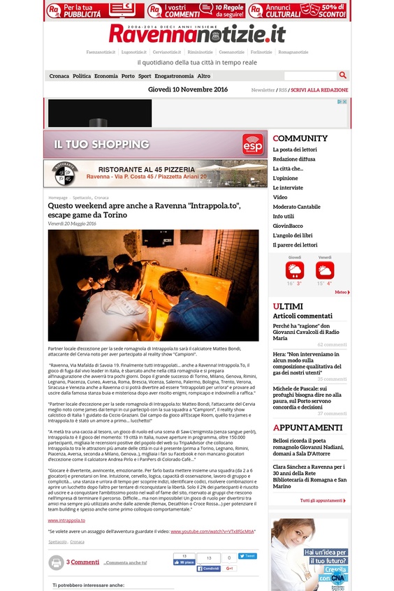 Partner locale d’eccezione per la sede romagnola di Intrappola.to sarà il calciatore Matteo Bondi, attaccante del Cervia noto per aver partecipato al reality show "Campioni". "Ravenna, Via Mafalda di Savoia 19. Finalmente tutti intrappolati… anche a Ravenna! Intrappola.To, il gioco di fuga dal vivo leader in Italia, è sbarcato anche nella città romagnola e si prepara all’inaugurazione che avverrà tra pochi giorni. Dopo il grande successo di Torino, Milano, Genova, Rimini, Legnano, Piacenza, Cuneo, Aversa, Roma, Brescia, Vicenza, Salerno, Palermo, Bologna, Trento, Verona, Siracusa e Venezia anche a Ravenna ci si potrà divertire ad essere “Intrappolati per un’ora” e provare ad uscire dalla famosa stanza buia e misteriosa dopo aver risolto enigmi, rompicapo e indovinelli a raffica." "Partner locale d’eccezione per la sede romagnola di Intrappola.to: Matteo Bondi, l’attaccante del Cervia meglio noto come James dai tempi in cui partecipò con la sua squadra a “Campioni”, il reality show calcistico di Italia 1 guidato da Ciccio Graziani. Dal campo da gioco all’Escape Room, quello tra James e Intrappola.to è stato un amore a primo… lucchetto!" "A metà tra una caccia al tesoro, un gioco di ruolo ed una scena di Saw-L’enigmista (senza sangue però!), Intrappola.to è il gioco del momento: 19 città in Italia, nuove aperture in programma, oltre 150.000 partecipanti, migliaia le recensioni positive del popolo del web su TripaAdvisor che collocano In