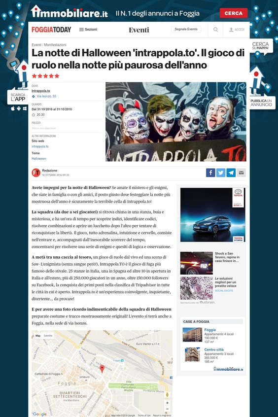Avete impegni per la notte di Halloween? Se amate il mistero e gli enigmi, che siate in famiglia o con gli amici, il posto giusto dove festeggiare la notte più mostruosa dell’anno è sicuramente la terribile cella di Intrappola.to! La squadra (da due a sei giocatori) si ritrova chiusa in una stanza, buia e misteriosa, e ha un’ora di tempo per scoprire indizi, identificare codici, risolvere combinazioni e aprire un lucchetto dopo l’altro per tentare di riconquistare la libertà. Il gioco, tutto adrenalina, intuizione e cervello, consiste nell’entrare e, accompagnati dall’inesorabile scorrere del tempo, concentrarsi per risolvere una serie di enigmi e quesiti di logica e osservazione. A metà tra una caccia al tesoro, un gioco di ruolo dal vivo ed una scena di Saw- L’enigmista (senza sangue però!), Intrappola.TO è il gioco di fuga più famoso dello stivale. 25 stanze in Italia, una in Spagna ed altre 10 in apertura in Italia e all’estero, più di 250.000 giocatori in un anno, oltre 150.000 followers su Facebook, la conquista dei primi posti nella classifica di Tripadvisor in tutte le città in cui è aperto. Intrappola.to è un’esperienza coinvolgente, inquietante, divertente… da provare!
