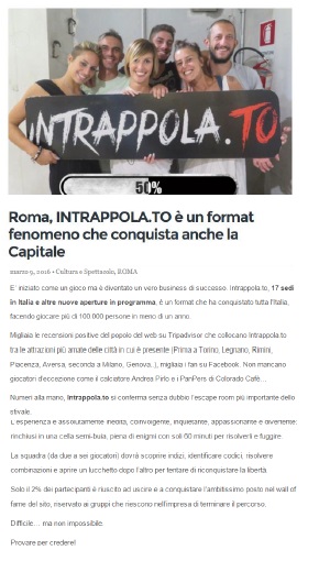 E’ iniziato come un gioco ma è diventato un vero business di successo. Intrappola.to, 17 sedi in Italia e altre nuove aperture in programma, è un format che ha conquistato tutta l’Italia, facendo giocare più di 100.000 persone in meno di un anno. Migliaia le recensioni positive del popolo del web su Tripadvisor che collocano Intrappola.to tra le attrazioni più amate delle città in cui è presente (Prima a Torino, Legnano, Rimini, Piacenza, Aversa, seconda a Milano, Genova..), migliaia i fan su Facebook. Non mancano giocatori d’eccezione come il calciatore Andrea Pirlo e i PanPers di Colorado Cafè… Numeri alla mano, Intrappola.to si conferma senza dubbio l’escape room più importante dello stivale. L’esperienza è assolutamente inedita, coinvolgente, inquietante, appassionante e divertente: rinchiusi in una cella semi-buia, piena di enigmi con soli 60 minuti per risolverli e fuggire. La squadra (da due a sei giocatori) dovrà scoprire indizi, identificare codici, risolvere combinazioni e aprire un lucchetto dopo l’altro per tentare di riconquistare la libertà. Solo il 2% dei partecipanti è riuscito ad uscire e a conquistare l’ambitissimo posto nel wall of fame del sito, riservato ai gruppi che riescono nell’impresa di terminare il percorso. Difficile… ma non impossibile. Provare per credere!