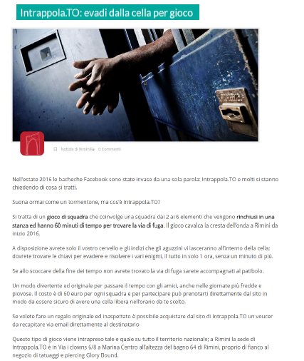 Nell’estate 2016 le bacheche Facebook sono state invase da una sola parola: Intrappola.TO e molti si stanno chiedendo di cosa si tratti. Suona ormai come un tormentone, ma cos’è Intrappola.TO? Si tratta di un gioco di squadra che coinvolge una squadra dai 2 ai 6 elementi che vengono rinchiusi in una stanza ed hanno 60 minuti di tempo per trovare la via di fuga. Il gioco cavalca la cresta dell’onda a Rimini da inizio 2016. A disposizione avrete solo il vostro cervello e gli indizi che gli aguzzini vi lasceranno all’interno della cella; dovrete trovare le chiavi per evadere e risolvere i vari enigmi, il tutto in solo 1 ora, senza un minuto di più. Se allo scoccare della fine dei tempo non avrete trovato la via di fuga sarete accompagnati al patibolo. Un modo divertente ed originale per passare il tempo con gli amici, anche nelle giornate più fredde e piovose. Il costo è di 60 euro per ogni squadra e per partecipare può prenotarti direttamente dal sito in modo da essere sicuro di avere una cella libera nell’orario da te scelto. Se volete fare un regalo originale ed inaspettato è possibile acquistare dal sito di Intrappola.TO un voucer da recapitare via email direttamente al destinatario Questo tipo di gioco viene intrapreso tale e quale su tutto il territorio nazionale; a Rimini la sede di Intrappola.TO è in Via i clowns 6/8 a Marina Centro all’altezza del bagno 64 di Rimini, proprio di fianco al negozio di tatuaggi e piercing Glory Bound. Le celle di Rimini sono aperte