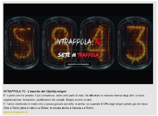 { "@context": "http://schema.org", "@type": "Organization", "url": "https://www.intrappola.to", "logo": "https://www.intrappola.to/assets/img/intrappolato_quadrato.jpq" , "contactPoint": [ { "@type": "ContactPoint", "telephone": "+393347733737", "contactType": "customer service" } ] }