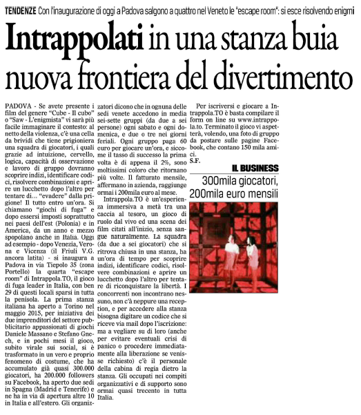 TENDENZE Con l'inaugurazione di oggi a Padova salgono a quattro nel Veneto le "escape room': si esce risolvendo enigmi PADOVA - Se avete presente i film del genere "Cube - Il cubo" o "Saw - L'enigmista" vi sarà più facile immaginare il contesto: al netto della violenza, c'è una cella da brividi che tiene prigioniera una squadra di giocatori, i quali grazie ad intuizione, cervello, logica, capacità di osservazione e lavoro di gruppo dovranno scoprire indizi, identificare codici, risolvere combinazioni e aprire un lucchetto dopo l'altro per tentare di... "evadere" dalla prigione! Il tutto entro un'ora. Si chiamano "giochi di fuga" e dopo essersi imposti soprattutto nei paesi dell'est (Polonia) e in America, da un anno e mezzo spopolano anche in Italia. Oggi ad esempio - dopo Venezia, Verona e Vicenza (il Friuli V.G. ancora latita) - si inaugura a Padova in via Tiepolo 35 (zona Portello) la quarta "escape room" di Intrappola.TO, il gioco di fuga leader in Italia, con ben 29 di questi locali sparsi in tutta la penisola. La prima stanza italiana ha aperto a Torino nel maggio 2015, per iniziativa dei due imprenditori del settore pubblicitario appassionati di giochi Daniele Massano e Stefano Gne- ch, e in pochi mesi il gioco, subito virale sui social, si è trasformato in un vero e proprio fenomeno di costume, che ha accumulato già quasi 300.000 giocatori, ha 200.000 followers su Facebook, ha ap