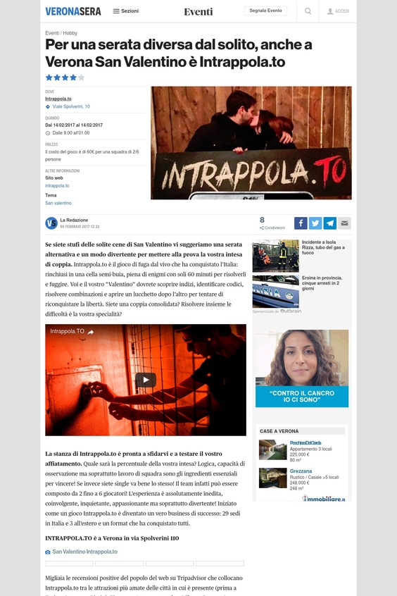 Per una serata diversa dal solito, anche a Verona San Valentino è Intrappola.to „Se siete stufi delle solite cene di San Valentino vi suggeriamo una serata alternativa e un modo divertente per mettere alla prova la vostra intesa di coppia. Intrappola.to è il gioco di fuga dal vivo che ha conquistato l’Italia: rinchiusi in una cella semi-buia, piena di enigmi con soli 60 minuti per risolverli e fuggire. Voi e il vostro “Valentino” dovrete scoprire indizi, identificare codici, risolvere combinazioni e aprire un lucchetto dopo l’altro per tentare di riconquistare la libertà. Siete una coppia consolidata? Risolvere insieme le difficoltà è la vostra specialità?“