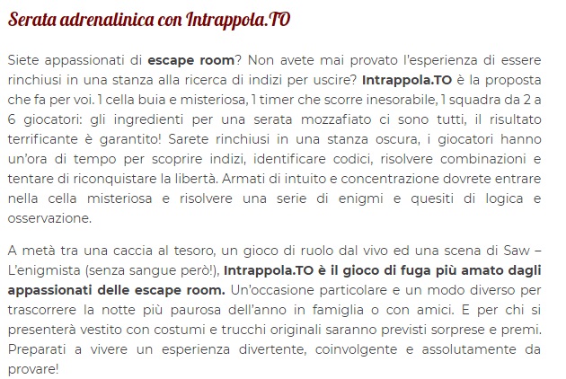 Serata adrenalinica con Intrappola.TO Siete appassionati di escape room? Non avete mai provato l’esperienza di essere rinchiusi in una stanza alla ricerca di indizi per uscire? Intrappola.TO è la proposta che fa per voi. 1 cella buia e misteriosa, 1 timer che scorre inesorabile, 1 squadra da 2 a 6 giocatori: gli ingredienti per una serata mozzafiato ci sono tutti, il risultato terrificante è garantito! Sarete rinchiusi in una stanza oscura, i giocatori hanno un’ora di tempo per scoprire indizi, identificare codici, risolvere combinazioni e tentare di riconquistare la libertà. Armati di intuito e concentrazione dovrete entrare nella cella misteriosa e risolvere una serie di enigmi e quesiti di logica e osservazione. A metà tra una caccia al tesoro, un gioco di ruolo dal vivo ed una scena di Saw – L’enigmista (senza sangue però!), Intrappola.TO è il gioco di fuga più amato dagli appassionati delle escape room. Un’occasione particolare e un modo diverso per trascorrere la notte più paurosa dell’anno in famiglia o con amici. E per chi si presenterà vestito con costumi e trucchi originali saranno previsti sorprese e premi. Preparati a vivere un esperienza divertente, coinvolgente e assolutamente da provare! Quando: 31 ottobre. Dove: Intrappola.TO, Via Sammartini 37, tel: 334 7733737, mail: milano@intrappola.to