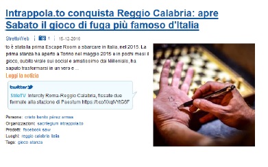 Finalmente tutti intrappolati… anche a Reggio Calabria! Intrappola.To, il gioco di fuga dal vivo leader in Italia, è arrivato per la prima volta in Calabria e si prepara all’inaugurazione che avverrà Sabato 17 Dicembre. Intrappola.to è stata la prima Escape Room a sbarcare in Italia, nel 2015. La prima stanza ha aperto a Torino nel maggio 2015 e in pochi mesi il gioco, subito virale sui social e amatissimo dai Millenials, ha saputo trasformarsi in un vero e proprio fenomeno di costume. 27 stanze in Italia, due in Spagna ed altre 10 in apertura in Italia e all’estero, più di 250.000 giocatori in un anno, oltre 150.000 followers su Facebook, la conquista dei primi posti nella classifica di Tripadvisor in tutte le città in cui è aperto. I numeri parlano da soli: Intrappola.to è un format di grande successo. A metà tra una caccia al tesoro, un gioco di ruolo dal vivo ed una scena di Saw-L’enigmista (senza sangue però!), Intrappola.TO è un gioco, un’esperienza coinvolgente, inquietante, appassionante, assolutamente divertente. La squadra (da due a sei giocatori) che si ritrova chiusa in una stanza, ha un’ora di tempo per scoprire indizi, identificare codici, risolvere combinazioni e aprire un lucchetto dopo l’altro per tentare di riconquistare la libertà. Il gioco, tutto adrenalina, intuizione e cervello, consiste nell’entrare e, accompagnati dall’inesorabile scorrere del tempo, concentrarsi per risolvere una serie di enigmi e giochi di logica e osservazione.