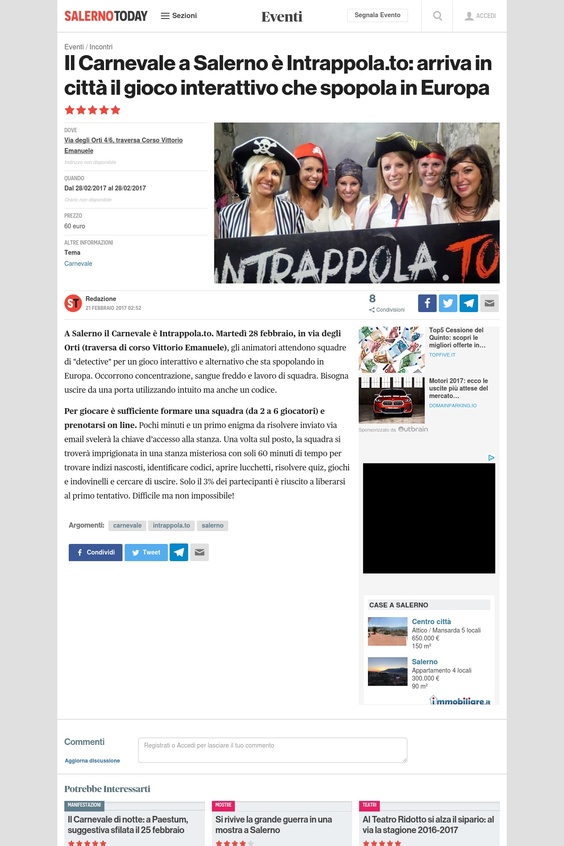 Il Carnevale a Salerno è Intrappola.to: arriva in città il gioco interattivo che spopola in Europa Eventi a Salerno A Salerno il Carnevale è Intrappola.to. Martedì 28 febbraio, in via degli Orti (traversa di corso Vittorio Emanuele), gli animatori attendono squadre di "detective" per un gioco interattivo e alternativo che sta spopolando in Europa. Occorrono concentrazione, sangue freddo e lavoro di squadra. Bisogna uscire da una porta utilizzando intuito ma anche un codice. Per giocare è sufficiente formare una squadra (da 2 a 6 giocatori) e prenotarsi on line. Pochi minuti e un primo enigma da risolvere inviato via email svelerà la chiave d’accesso alla stanza. Una volta sul posto, la squadra si troverà imprigionata in una stanza misteriosa con soli 60 minuti di tempo per trovare indizi nascosti, identificare codici, aprire lucchetti, risolvere quiz, giochi e indovinelli e cercare di uscire. Solo il 3% dei partecipanti è riuscito a liberarsi al primo tentativo. Difficile ma non impossibile!