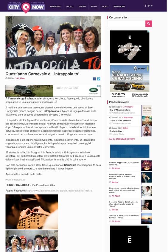 A Carnevale ogni scherzo vale, si sa, e se lo scherzo fosse quello di chiudere i propri amici in una stanza buia e misteriosa…? A metà tra una caccia al tesoro, un gioco di ruolo dal vivo ed una scena di Saw- L’enigmista (senza sangue però!), Intrappola.to è il gioco di fuga più famoso dello stivale che darà un tocco di adrenalina al vostro Carnevale! La squadra (da 2 a 6 giocatori) rinchiusa all’interno della stanza ha un’ora di tempo per scoprire indizi, identificare codici, risolvere combinazioni e aprire un lucchetto dopo l’altro per tentare di riconquistare la libertà. Il gioco, tutto brivido, intuizione e cervello, consiste nell’entrare e, accompagnati dall’inesorabile scorrere del tempo, concentrarsi per risolvere una serie di enigmi e quesiti di logica e osservazione. Intrappola.to è un’esperienza coinvolgente, inquietante, divertente, un’idea regalo originale, spassosa ed intelligente, l’attività perfetta per riempire i pomeriggi di vacanza e rendere unico il vostro Carnevale. 29 stanze in Italia, 2 in Spagna, 1 in Francia ed altre 10 in apertura in Italia e all’estero, più di 300.000 giocatori, oltre 200.000 followers su Facebook e la conquista dei primi posti nella classifica di Tripadvisor in tutte le città in cui è aperto.